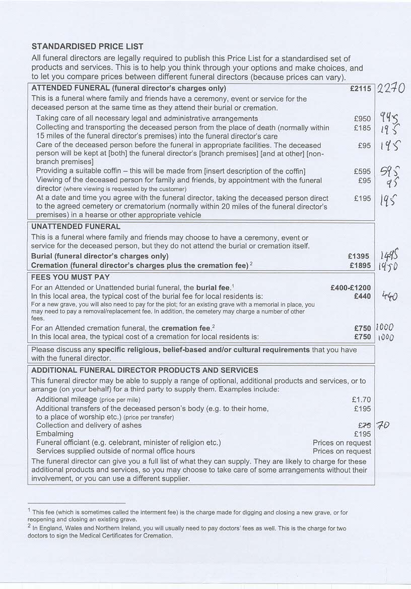 All funeral directors are legally required to publish this Price List for a standardised set of products and services. This is to help you think through your options and make choices, and to let you compare prices between different funeral directors (because prices can vary).
